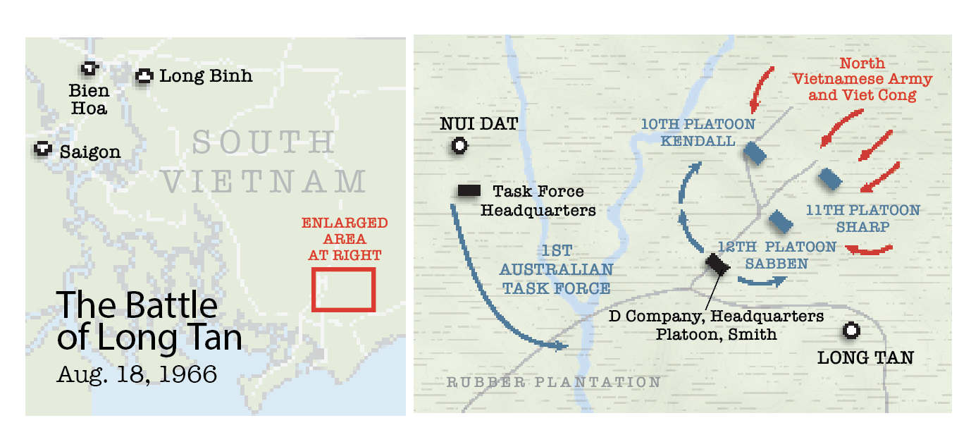 On the late afternoon of Aug. 18, 1966, Australian Maj. Harry Smith and the men in his Delta Company faced a vastly superior force of 2,500 heavily armed Viet Cong and North Vietnamese Army troops at an abandoned rubber plantation near Long Tan, a village about 40 miles southeast of Saigon. Against all odds, the Australians held out for more than three hours until reinforcements arrived. The 108 men of D Company, 6th Battalion, Royal Australian Regiment, Australian and New Zealand Army Corps, fought for their lives in the pouring rain as ammunition dwindled, casualties mounted and the enemy massed for a final assault. There seemed to be no way the Aussies could survive the onslaught.