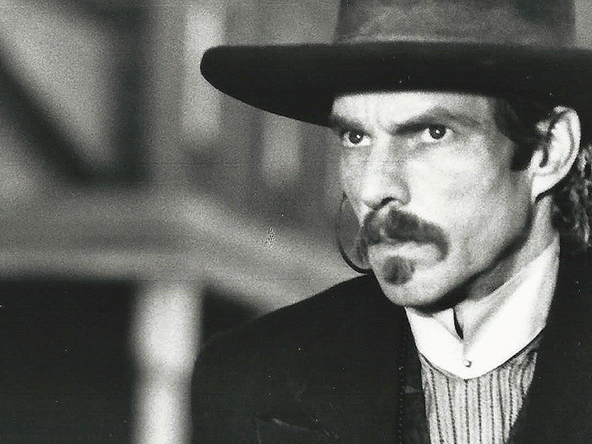 After Val Kilmer electrified the Western film world with his portrayal of Doc Holliday in the 1993 movie Tombstone, Holliday re-enactors soon outnumbered Wyatt Earp re-enactors in the town of Tombstone. And at an Old West gunfighter seminar held there not long after the film’s release, one Doc Holliday clone bragged he had already watched Tombstone more than 200 times—not because it was a Wyatt Earp movie, but because it had now become a Doc Holliday movie, thanks to Kilmer’s performance. Kilmer’s Doc carries an ivory-gripped, nickelplated Model 1877 Colt Lightning/Thunderer double-action revolver in a shoulder holster as his first weapon of choice. He also carries an ivory-gripped Colt Single Action Army model in a hip holster.