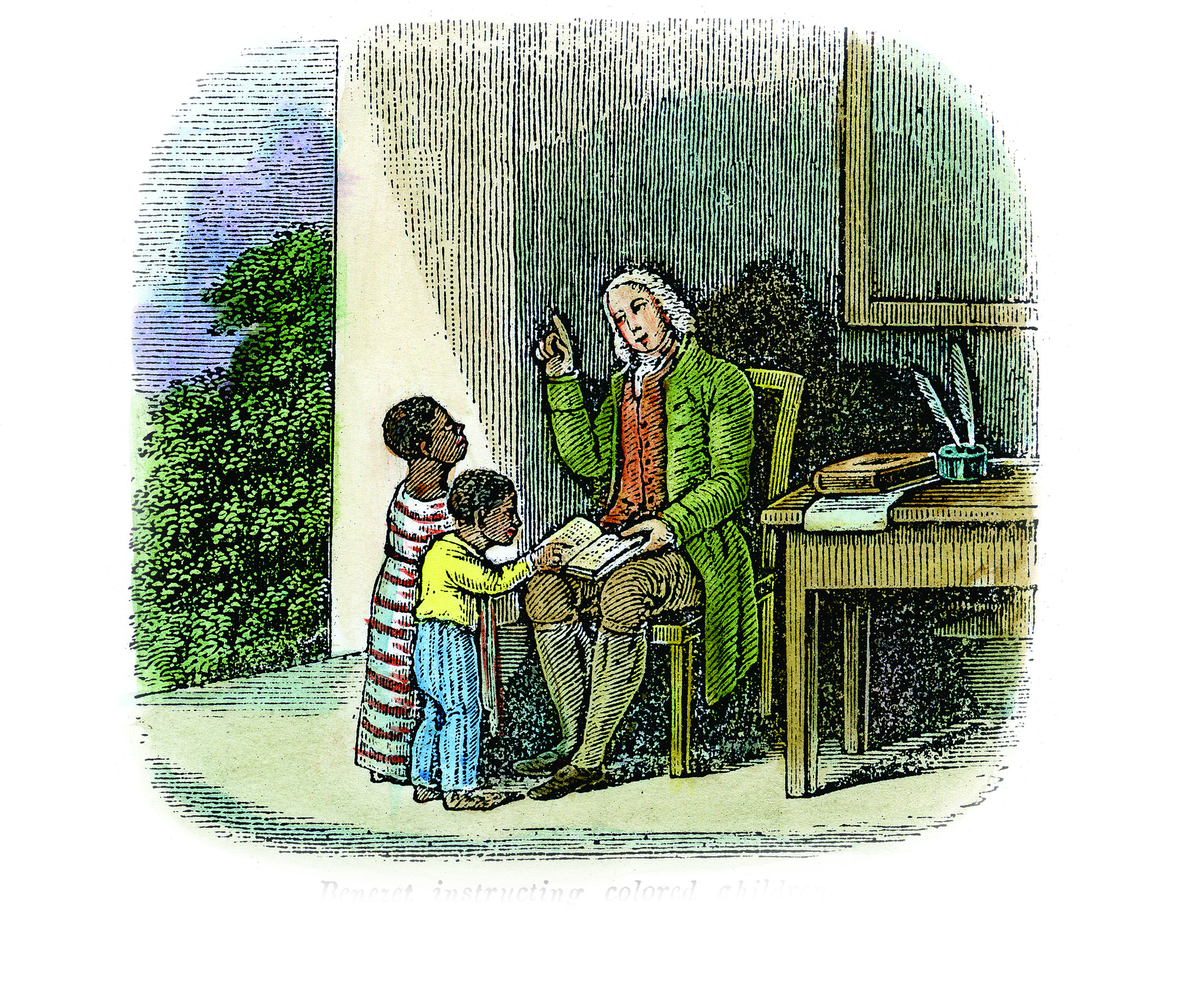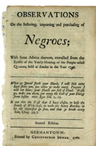 Woolman had an influential ally in Anthony Benezet. Though not nearly as dramatic as Lay, Benezet, an émigré from France via London, worked tirelessly within the Quaker system. A prolific writer, he penned many pamphlets and petitions, beginning with 1759’s Observations on the Enslaving, Importing, and Purchasing of Negroes. Benezet said if Friends believed God was in every man, bondage must be a sin. Teaching black children in his home at night, he promoted the novel idea that all people are capable of learning and thus are equal and deserving of freedom. Benezet and allies among the Friends made their arguments to government as well as to fellow believers.