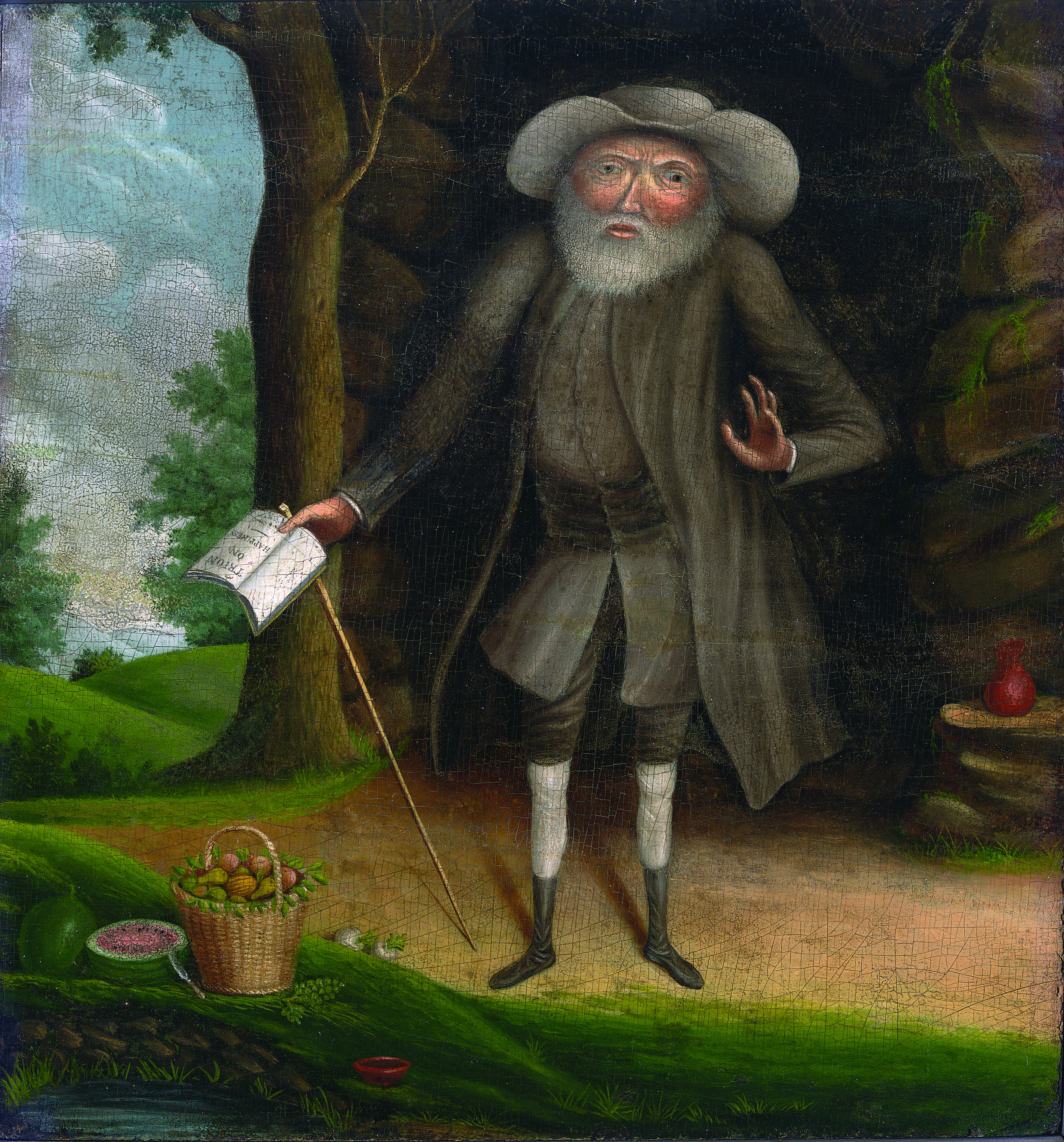 On Friday, September 19, 1738, Lay attended a large Quaker assembly, the Philadelphia Yearly Meeting, in Burlington, New Jersey. Wearing a military greatcoat over a soldierly uniform, complete with sword, he carried a book. In a hollow between the covers, he had fitted an animal bladder brimful of pokeberry juice, which runs a rich red. When his turn to speak came he hefted the oversize volume, railing at Friends whose hands Lay decried as soiled by bondage. “Thus shall God shed the blood of those persons who enslave their fellow creatures!” the strange little man shouted, throwing off his coat, pulling his blade, and stabbing the book. Gouts of red splattered him and all nearby, shocking everyone at hand. Ejected from the hall, Lay went along without protest. Soon after, disowned—excommunicated—by his home Monthly Meeting in Abington, Pennsylvania, Lay dropped from sight and the Quaker community, living for 20 years as a hermit in a cave outside Abington.