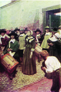 At home and abroad, English society assumed less commercially minded Friends to be anti-government. Quaker missionaries Mary Fisher and Anne Foster sailed from Barbados to Boston in 1656, encountering the wrath of the city’s Puritan leadership. After five weeks behind bars, the two were shipped back to Barbados. They got off light; during 1659-61, the gibbet at Boston Common saw four Friends hanged for merely entering the colony. Around this time, Quaker preachers also were reaching the southern American colonies.