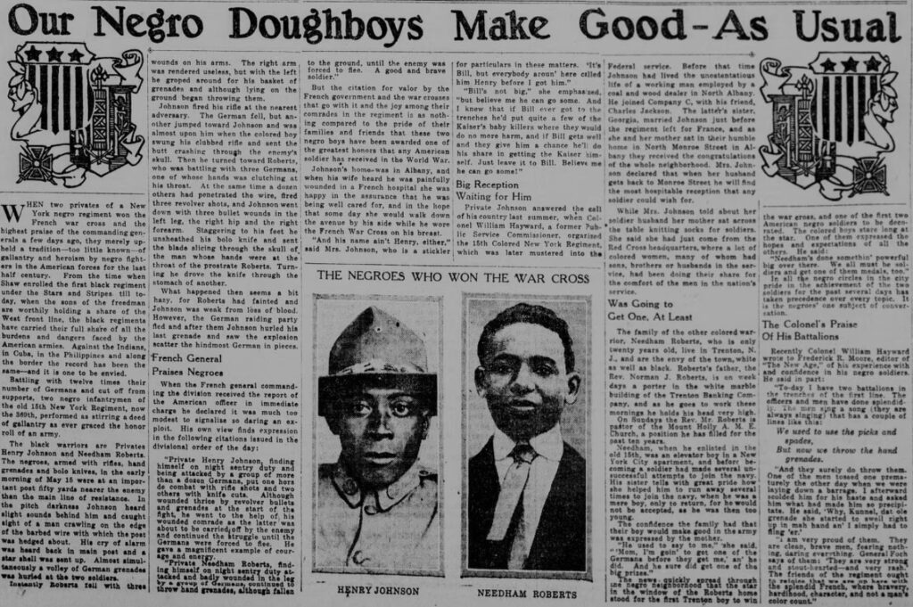 Johnson’s ferocity earned him the nickname “Black Death.” In recognition of his actions, France awarded him with the Croix de Guerre with a Gold Palm for extraordinary valor, making Johnson the first American to receive France’s highest award for bravery. Roberts also received the Croix de Guerre.