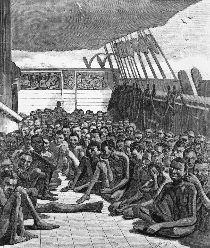 A slaving ship had one or two slave decks, stacked at either side, with 4’ of head room. Into that space were crammed naked Africans manacled spoon-fashion, all but unable to move, wallowing in their waste, the only ventilation a porthole or two. A double-decked New England slave ship could carry 100 captives. Slave decks were deliberately hellish, to discourage uprisings and escape attempts. Slavers separated men and women and, to thwart efforts at conspiracy, shackled together individuals who did not speak one another’s languages. Crewmen, who carried or had access to arms, raped female slaves. Captives died of seasickness, dehydration, starvation, malnutrition, dysentery, and smallpox. In 1764, aboard Sally, owned by the Brown family, more than half of a cargo of 196 captives bought in Africa died at sea. Crewmen flung the corpses overboard.