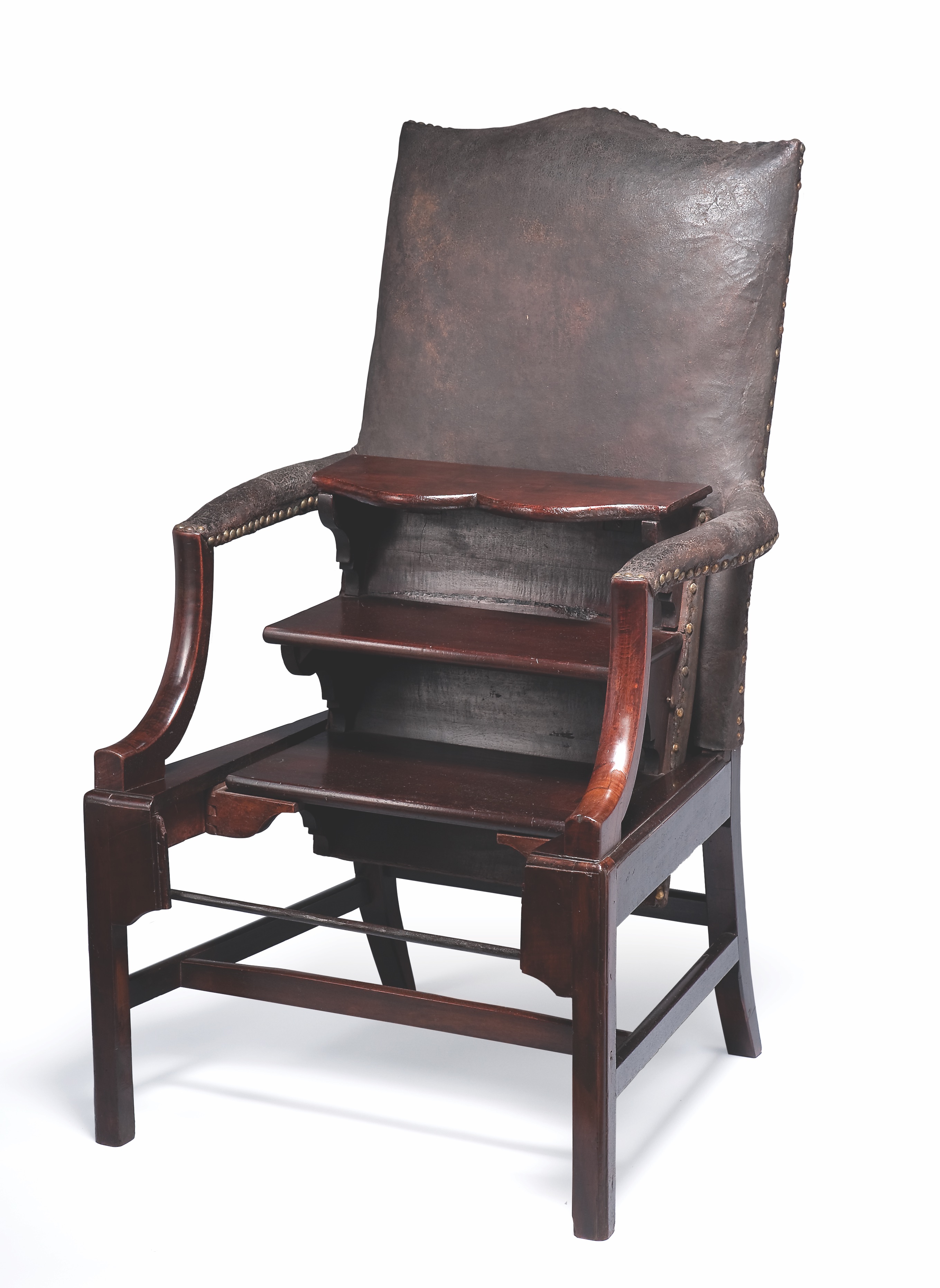 He made it easy to grab books. Franklin, a bibliophile, assembled one of the largest personal libraries in the colonies. To accommodate his books, he had to install shelves he could not reach. A born adapter, Franklin reconfigured a chair, adding hinged steps a user could swing into place and ascend as if on a ladder. Franklin sat in the chair while presiding over American Philosophical Society meetings in his library, leading acquaintances to call the piece of furniture “the president’s chair.” Another of Franklin’s book-related creations was the “long arm,” a board fitted with a cable that controlled two “fingers” at one end. A tug on the line caused the wooden appendages to close like a thumb and forefinger. Now largely absent from libraries, this device, in metallic form, sees use as a highway cleanup tool. (Library Chair with Folding Steps, 1760-80/Attributed to Benjamin Franklin/Mahogany, leather and metal/American Philosophical Society. Gift of Richard Bache, 1792/Photo credit: Brent Wahl)