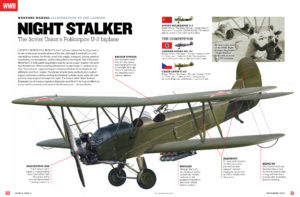 A SIMPLY DESIGNED AIRCRAFT, the U-2 (later dubbed the Po-2) Night Stalker proved to be one of the most versatile planes of the war. Although it was built as a civil and military trainer, the Soviets used it for supply, transport, liaison, medical evacuation, reconnaissance, and bombing duties. Starting in 1942 Polikarpov fitted the U-2 with underwing bomb racks for use as a night bomber—its most well-known role. When targeting bivouacked enemy troops, U-2 pilots often flew “low and slow,” approaching at treetop level before throttling back and gliding in over their targets. The abrupt attacks had a marked psychological impact on German soldiers resting well behind the lines; many units felt compelled to stay on guard through the night. The Soviet 588th Night Bomber Regiment, an all-woman squadron, famously used their U-2s to great effect on nocturnal harassment raids against the German rear. —Paraag Shukla